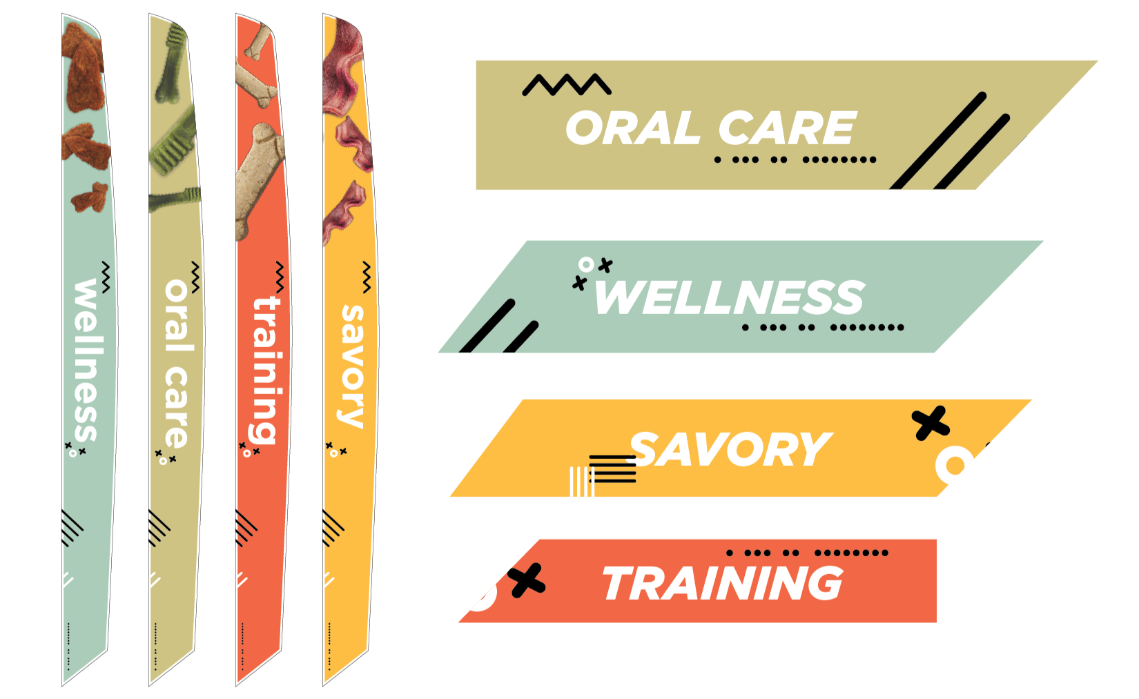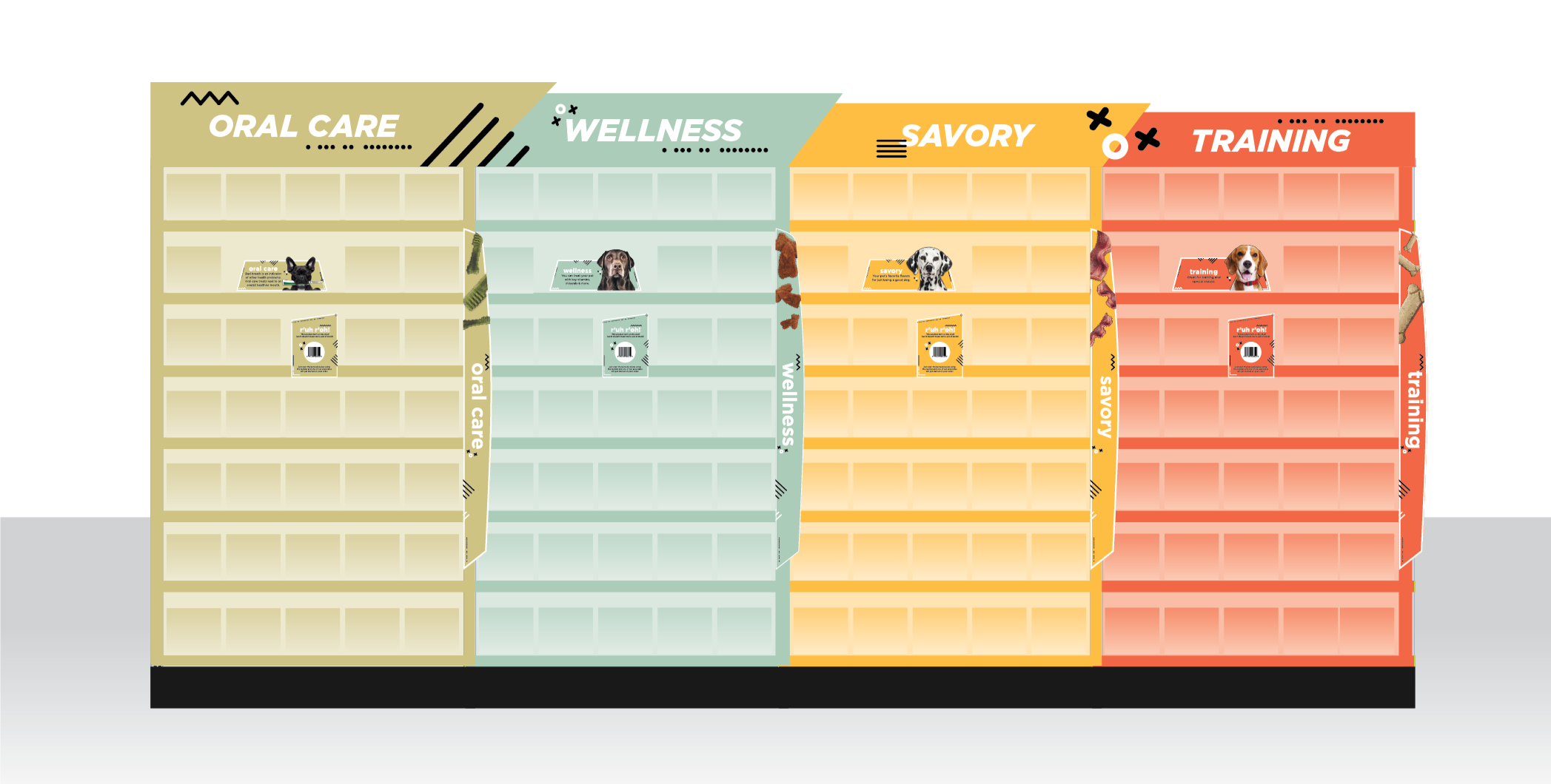Starting with the categories, we sectioned the aisle based on benefits and size: oral care, wellness, savory, and training. Oral care to keep your dog’s teeth healthy and reduce the risk of gum disease, Wellness for the stubborn pups who refused to take their medicine, and for treats that had extra nutritional benefits, Savory for the irresistible everyday treats and special snacks, and Training, which were small enough to fit in your pocket or pouch and easy to chew for puppies.